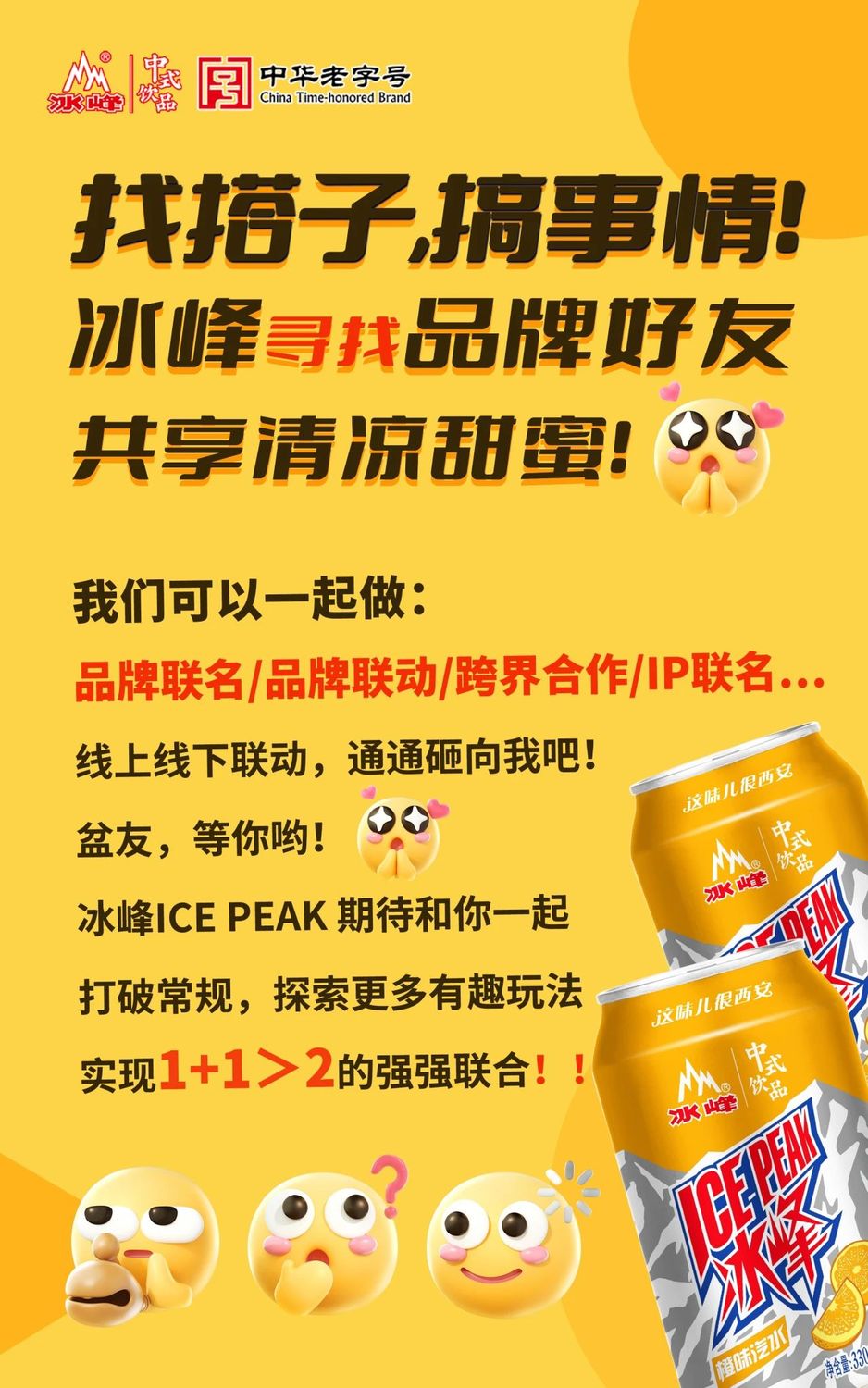 一起玩转跨界,解锁无限可能!发表时间:2025-02-22 08:30 1948年,一瓶橙味汽水,开启了冰峰跨越七十余载的传奇历程。从巷口小摊到全国餐桌,从玻璃瓶里的童年记忆到“中国好礼”的文化符号,冰峰不仅是一口清爽的汽水,更是一代人舌尖上的乡愁、一座城烟火气的缩影。 今天,这瓶承载着陕味基因的国民汽水,正式向全行业伸出橄榄枝——诚邀各领域的品牌伙伴,以跨界之力碰撞创意火花,用多元场景焕活老字号新魅力,共同书写“冰峰+”生态圈的共赢篇章!